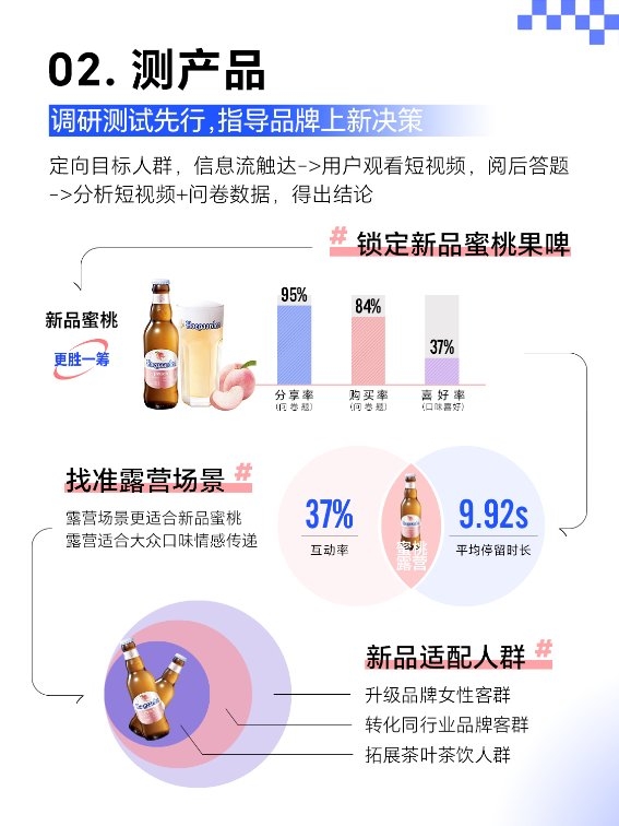 為了更快、更準(zhǔn)地抓住抖音市場機(jī)會,福佳在新品實驗室指導(dǎo)下,詳細(xì)制定2個新品×9個人群×4套素材的測試方案。針對目標(biāo)客群、內(nèi)容、商品,通過信息流快速觸達(dá)進(jìn)行測試,得出新品潛力、人群價值及受訪者偏好的內(nèi)容場景,發(fā)現(xiàn)蜜桃口味更受消費者偏愛,適合在露營場景進(jìn)行傳播。福佳基于此進(jìn)行貨品布局,確定整體策略的優(yōu)化方向。