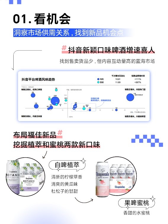 基于巨量云圖商品洞察能力,福佳對抖音啤酒大盤現(xiàn)狀及細(xì)分賽道趨勢進(jìn)行分析,發(fā)現(xiàn)抖音啤酒細(xì)分類目均正增長,其中白啤增長最可觀,果啤趨向高客單商品。進(jìn)一步洞察抖音啤酒風(fēng)味趨勢發(fā)現(xiàn),新穎口味啤酒增速喜人,黃瓜和桃子兩種口味受抖音消費者關(guān)注,但市場的針對性供給較少,蘊含巨大的發(fā)展?jié)摿?這恰巧與福佳現(xiàn)有產(chǎn)品組合高度匹配。