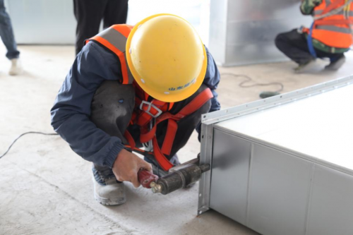 本次競賽分為風管加工及安裝、支架焊接兩項分項競賽。在風管加工及安裝分項競賽中,評委組選取防排煙系統(tǒng)分支三通作為競賽內(nèi)容,提供風管三通半成品部件,參賽工人結合原設計圖紙,開展風管合口、法蘭鉚接及風管安裝作業(yè)。在支架焊接分項競賽中,評委組選取統(tǒng)一的綜合支架,繪制大樣圖,提供相關工具及材料,參賽人員按照圖紙下料、焊接并完成綜合支架施工。
