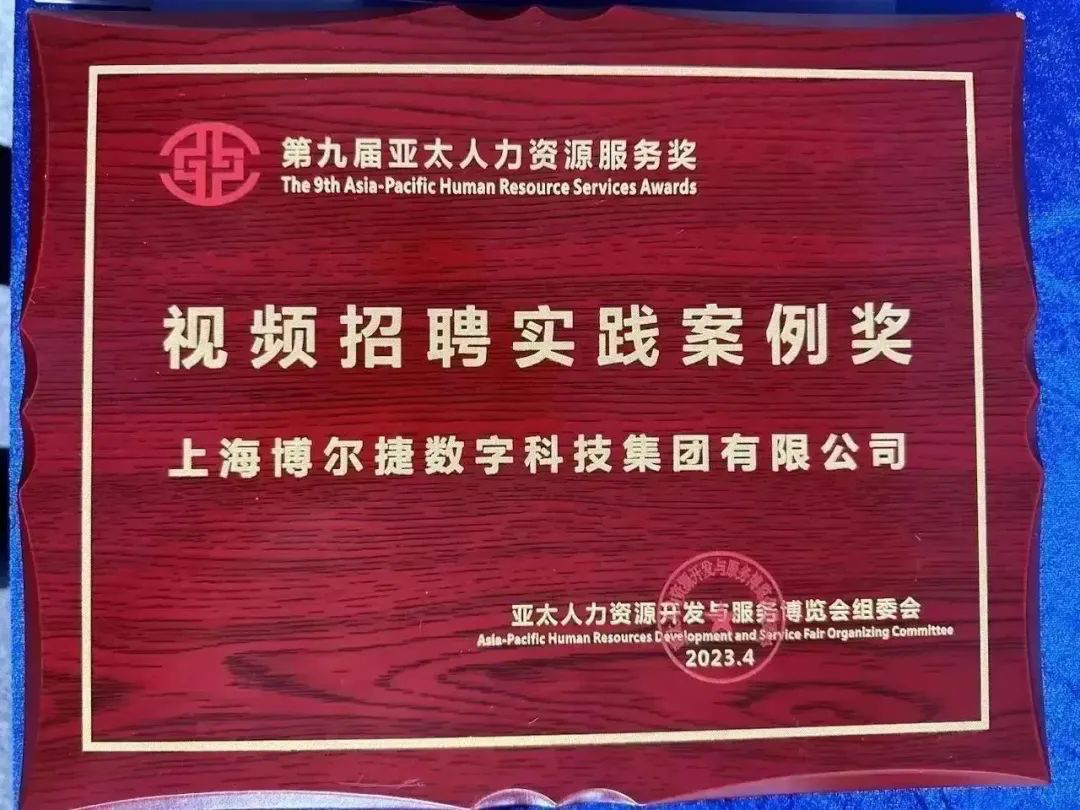 在頒獎儀式上,博爾捷數字科技集團一攬第九屆亞太人力資源服務獎兩項大獎:數字化應用獎和最佳實踐案例-視頻實踐案例獎。