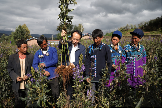 耿福能親自到田間地頭指導彝族群眾種植中藥材