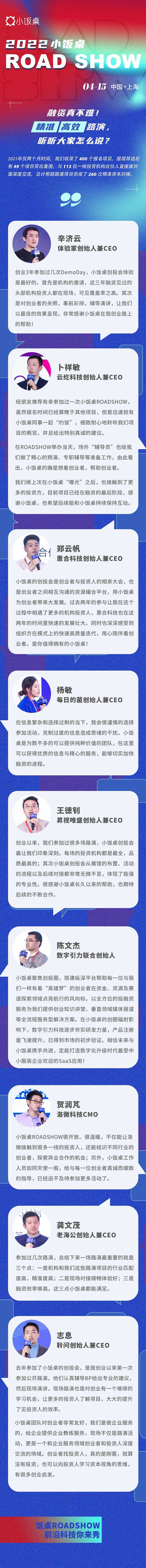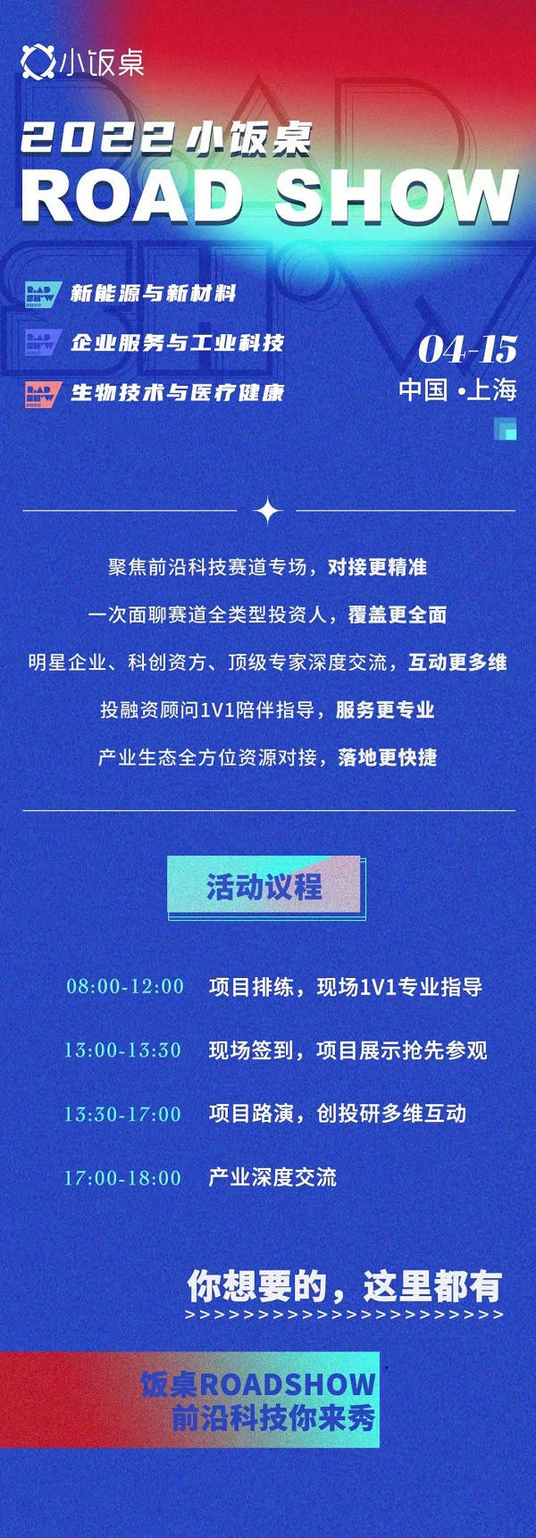 導(dǎo)語(yǔ):4月15日,2022小飯桌ROASHOW將登陸上海,將開(kāi)設(shè)“新能源與新材料”、“企業(yè)服務(wù)與工業(yè)科技”、“生物技術(shù)與醫(yī)療健康”賽道專(zhuān)場(chǎng)路演,歡迎各位優(yōu)秀的科技創(chuàng)業(yè)者前來(lái)應(yīng)戰(zhàn)!