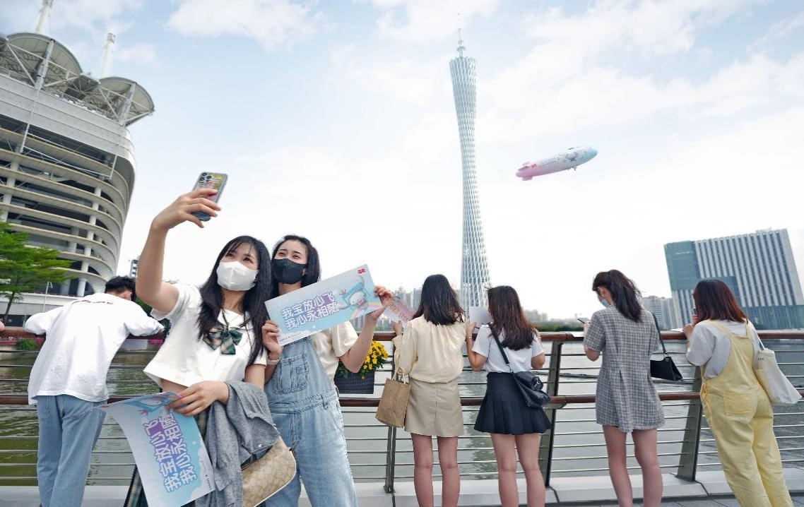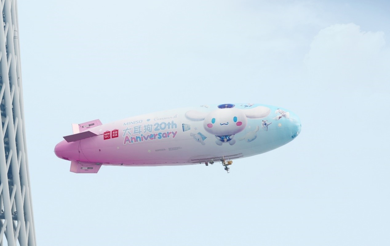 在“大耳狗20周年”期間,名創(chuàng)優(yōu)品于3月19日當(dāng)天獨家打造了一架豪華飛艇,把“大耳狗寵上天”。這架飛艇圍繞廣州塔、海心橋、獵德大橋環(huán)繞飛行,從下往上看飛艇的外觀,正是大耳狗20周年慶主題海報。隨著飛艇乘風(fēng)而上,大耳狗仿佛躲進(jìn)輕紗包裹般的云端里,沖著地面的人打趣逗樂。
