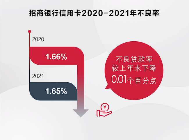 近年來,經(jīng)濟(jì)承壓、共債風(fēng)險(xiǎn)、監(jiān)管趨嚴(yán)、業(yè)務(wù)收緊等因素使信用卡行業(yè)的風(fēng)險(xiǎn)管控面臨較大壓力,但招行信用卡不良率穩(wěn)中有降,風(fēng)險(xiǎn)平穩(wěn)可控。據(jù)財(cái)報(bào),2021年,招行信用卡新生成不良貸款292.06億元,同比減少32.35億元,信用卡不良率1.65%,較上年末下降0.01個(gè)百分點(diǎn)。