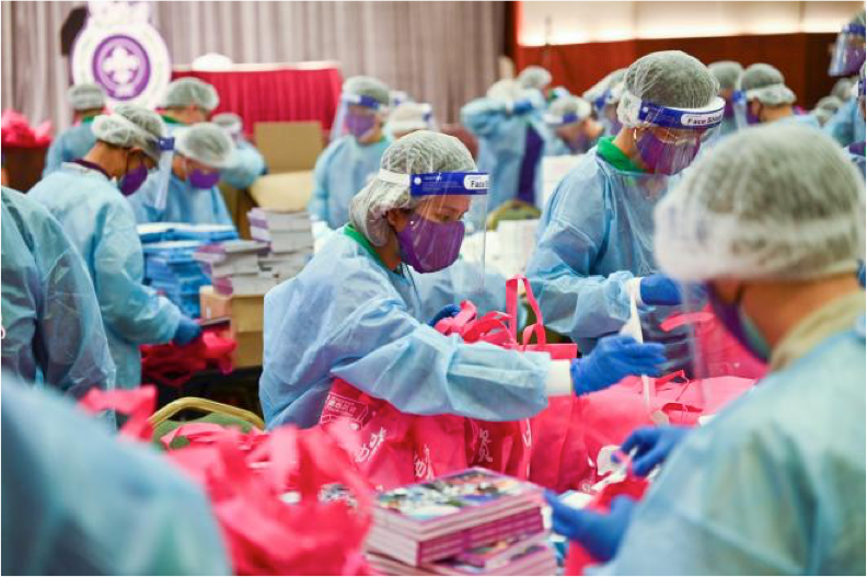 香港童軍總會(huì)義工包裝抗疫包。(圖片來(lái)源:青少年抗疫連線)