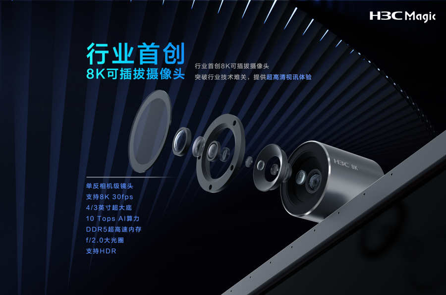 值得關(guān)注的是,行業(yè)首創(chuàng)的8K可插拔攝像頭,采用遠(yuǎn)超傳統(tǒng)會議一體機(jī)和手機(jī)芯片的4/3英寸超大尺寸感光傳感器,搭配無畸變非球面玻璃鏡頭與f/2.0大光圈,配備10Tops AI算力和DDR5超高速的內(nèi)存,并且能夠支持8K 30fps與HDR功能,敏銳捕捉光源信息變化的同時快速反饋完成視覺成像,保證了超高清的視訊體驗,靈動捕捉每一幀超真感視效。同時,攝像頭能夠支持即插即用功能,為高敏感行業(yè)的隱私訴求提供了更好地選擇,最大限度保障用戶信息安全。