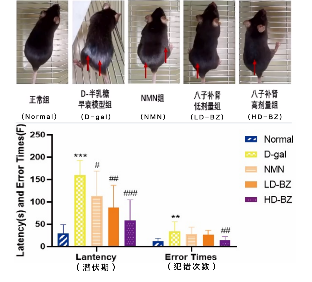 北京中醫(yī)藥大學(xué)科研人員采用D-gal誘導(dǎo)衰老小鼠模型,連續(xù)給藥60日,評(píng)價(jià)八子補(bǔ)腎膠囊改善腦功能的效果及作用機(jī)制。巴恩斯迷宮實(shí)驗(yàn)結(jié)果表明,八子補(bǔ)腎組小鼠在縮短逃避潛伏期、減少犯錯(cuò)次數(shù)上均有明顯作用(P<0.001;P<0.01)。