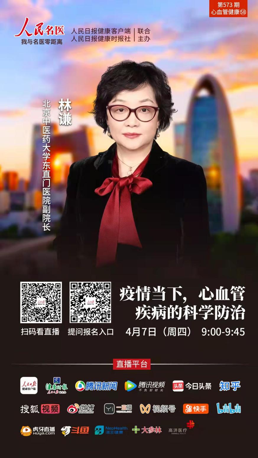 4月7日上午9:00~9:45,以嶺藥業(yè)聯(lián)合人民日報(bào)健康客戶端策劃的世界健康日直播訪談節(jié)目《疫情當(dāng)下,心腦血管疾病的科學(xué)防治》,特別邀請到北京中醫(yī)藥大學(xué)東直門醫(yī)院副院長林謙為大家進(jìn)行權(quán)威解答!