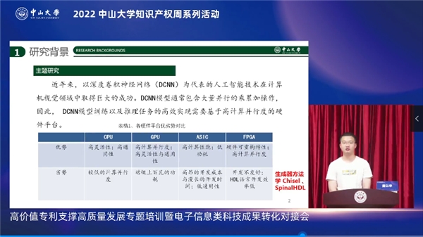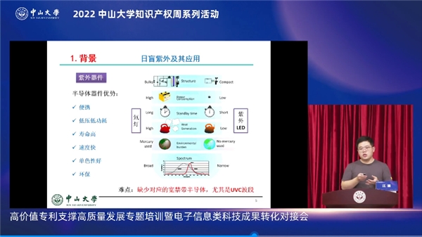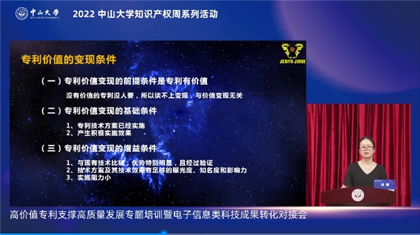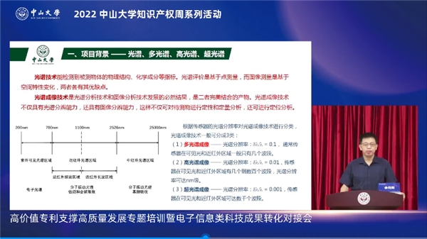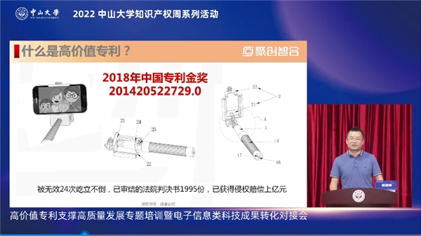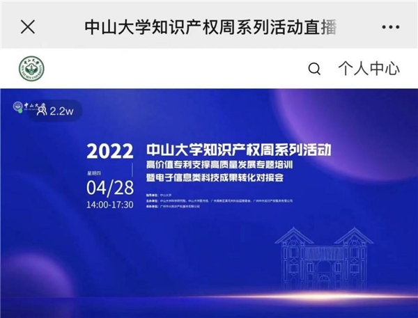 2022年4月28日,在中山大學的全程指導及越秀區(qū)政府的鼎力支持下,中山大學科學研究院、廣州高新區(qū)黃花崗科技園管委會、中山大學圖書館、廣州中大知識產權服務有限公司共同成功主辦中山大學知識產權周系列活動高價值專利支撐高質量發(fā)展專題培訓暨電子信息類科技成果轉化對接會。本次活動采取線上方式開展,邀請兩位業(yè)界專家圍繞高價值專利支撐高質量發(fā)展做專題報告,多達178項電子信息類專利項目與83家企業(yè)進行了精準對接,活動在線人數(shù)超2.2萬人,多位知識產權專家及知名企業(yè)在云端匯聚,助力知識產權高質量發(fā)展。