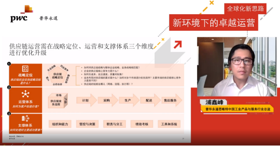 浦鑫峰表示,供應鏈正成為企業(yè)實現(xiàn)全球增長的重要手段之一,呈現(xiàn)全球化、定制化、智能化等發(fā)展趨勢。聚焦國內(nèi)眾多出海企業(yè),現(xiàn)有供應鏈體系多面臨短期無法充分滿足海外市場需求、中長期無法更好支撐海外業(yè)務發(fā)展以及全球化對供應鏈運營提出的更高要求等挑戰(zhàn)。普華永道結(jié)合成功項目經(jīng)驗及行業(yè)洞察,幫助企業(yè)通過對供應鏈戰(zhàn)略定位、運營體系和支撐體系三個維度的優(yōu)化升級,打造端到端卓越供應鏈運營能力,提升運營效率、實現(xiàn)規(guī)模經(jīng)濟效益、并優(yōu)化對海外業(yè)務的管理和管控,進一步推動全球化業(yè)務發(fā)展。