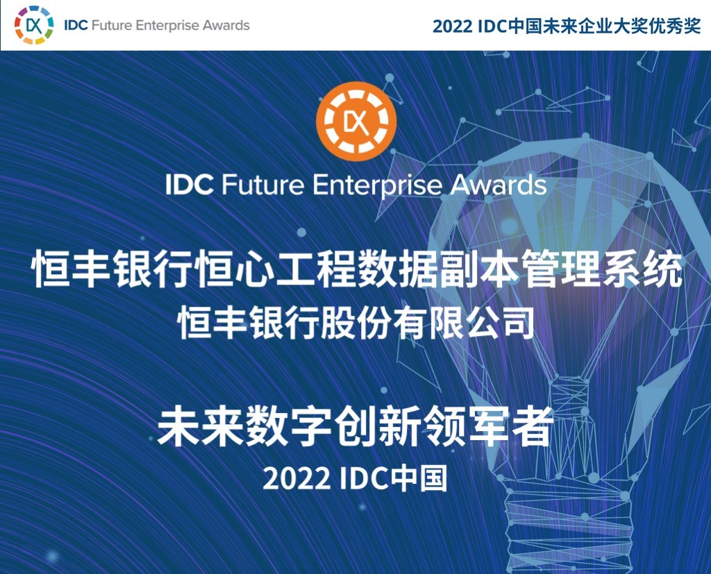 9月1日,IDC中國正式發(fā)布2022IDC中國未來企業(yè)大獎優(yōu)秀案例獲獎名單,恒豐銀行憑借恒心工程數據副本管理系統項目獲評“未來數字創(chuàng)新領軍者”優(yōu)秀獎。