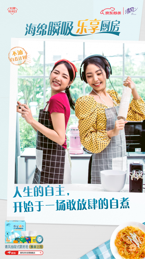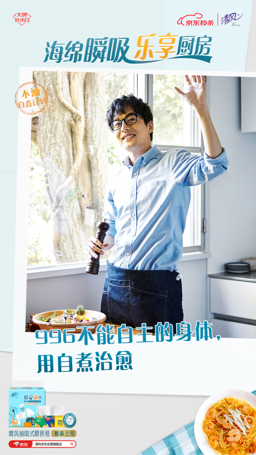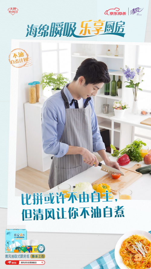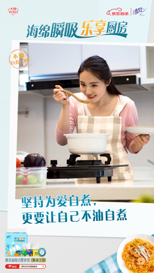 為此,清風(fēng)推出“不油自煮計(jì)劃”, 以煥新上市的清風(fēng)海綿吸廚房紙巾為依托,用“一抹即凈”的不油體驗(yàn)和“一掃就會(huì)”的自煮攻略,幫助用戶破除廚房恐懼,給不同身份的用戶輕松自煮不油膩的廚房體驗(yàn),讓TA們能不由自主地愛上烹飪,輕松享受做飯帶來的快樂。