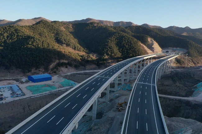 匠心獨(dú)運(yùn) 科技賦能引領(lǐng) 項(xiàng)目地處山區(qū),橋隧比高達(dá)70.7%。干柴峪、林家峪兩座大橋合計(jì)全長(zhǎng)1018米,宛若天虹跨于高峽之上。