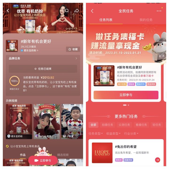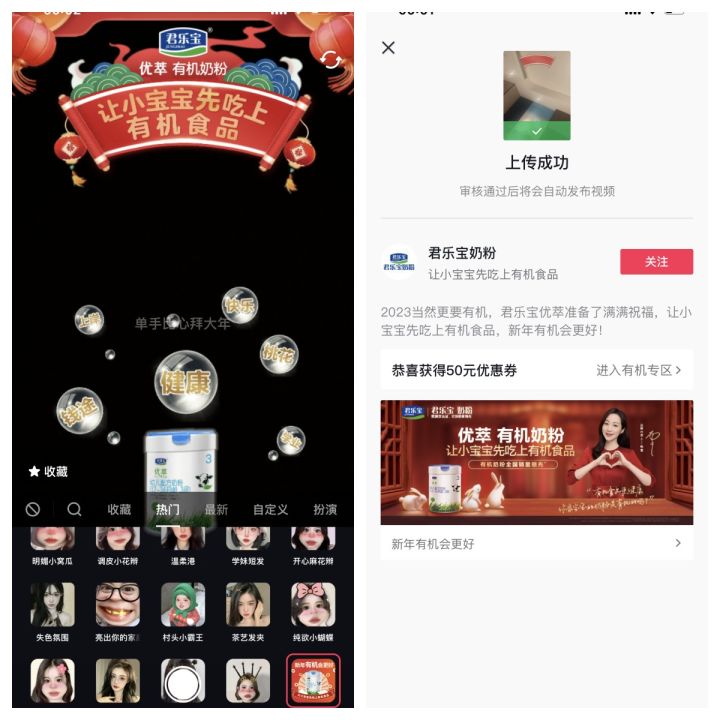 基于新一代母嬰人群所追求沉浸感和參與感,信賴場景式安利、沉浸式感受,因而優(yōu)萃有機(jī)奶粉攜手巨量引擎在基礎(chǔ)品牌信息的純曝光宣傳之外,共創(chuàng)了一系列多元互動玩法,如找紅包、集節(jié)氣卡、挑戰(zhàn)賽貼紙等,在點燃新春氛圍的同時加深了品牌與用戶深度互動,尤其是在抖音上發(fā)起的 #新年有機(jī)會更好 的話題挑戰(zhàn)賽,優(yōu)萃有機(jī)奶粉的有機(jī)賣點持續(xù)多次露出,活動各頁面上“優(yōu)萃有機(jī)奶粉,讓小寶寶先吃上有機(jī)食品”高度吸睛,最大程度覆蓋了用戶的目光所及之處,高密度投放且集中化曝光使得優(yōu)萃有機(jī)奶粉品牌價值理念在用戶心智中形成深刻記憶點。