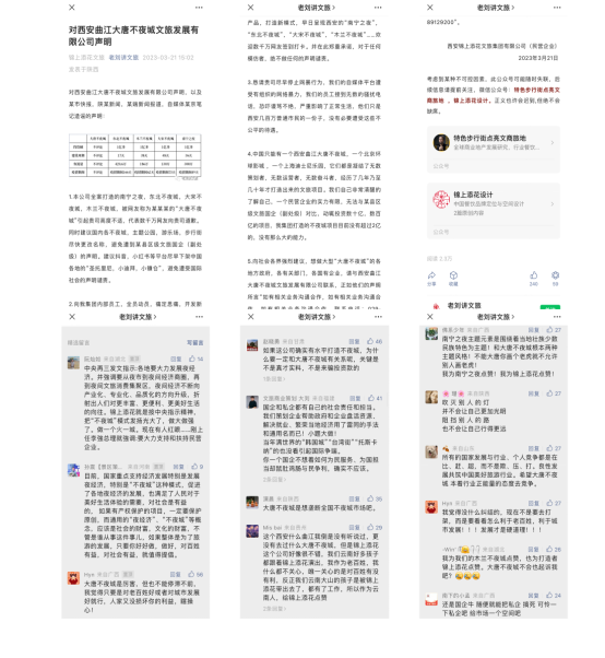錦上添花集團(tuán)在3月24日再次在公眾號(hào)“特色步行街點(diǎn)亮文商旅地”發(fā)布“加蓋公章”的公開(kāi)信指出:貴公司聲明第一處:發(fā)現(xiàn)網(wǎng)絡(luò)流傳“西安錦上添花”就是西安大唐不夜城的打造者”及“該集團(tuán)董事長(zhǎng)劉磊為大唐不夜城項(xiàng)目策劃師”等不實(shí)消息。我公司做出如下回復(fù):以上消息均為不實(shí)消息,我公司并不知情。上述消息的傳播均為他人行為或他人主導(dǎo)進(jìn)行網(wǎng)絡(luò)發(fā)布,他人行為未經(jīng)我公司授權(quán),更非我公司主導(dǎo),我公司絕不存在任何欺瞞、盜用等違法違規(guī)行為。