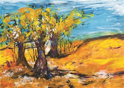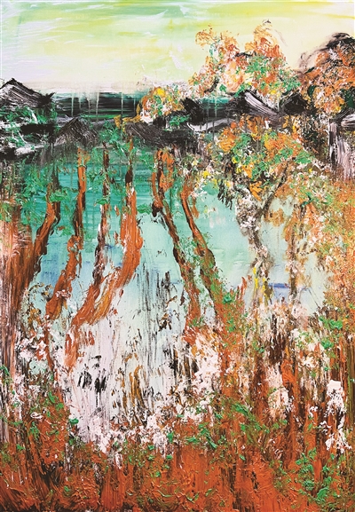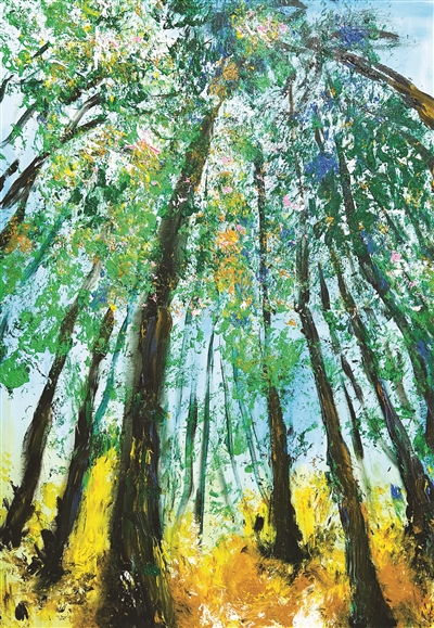吳冠中老先生曾說,中國畫不能“近親結(jié)婚”。因?yàn)槲覀兊囊曇蔼M窄。藝術(shù)是相通的,不分東方和西方。因此,劉家男不斷吸收東西方精華,并運(yùn)用于作品之中。她的作品既能呈現(xiàn)出西方作品的色彩美感,同時(shí)又兼具中國潑墨的畫面呈現(xiàn)。無論是胡楊林系列,還是天端系列、鯨落系列以及自然系列,其作品的整體色彩都是非常大膽的,給人以強(qiáng)烈的視覺沖擊。劉家男認(rèn)為,這是一個(gè)藝術(shù)家應(yīng)有的標(biāo)志性符號。