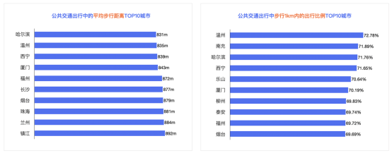 雖然哈爾濱通勤距離有所增加,但依舊是特大城市中綠色通勤指數(shù)最高的城市,沈陽(yáng)緊隨其后。同時(shí),哈爾濱的公共交通出行中平均步行距離短,且步行一公里內(nèi)的出行比例較高。