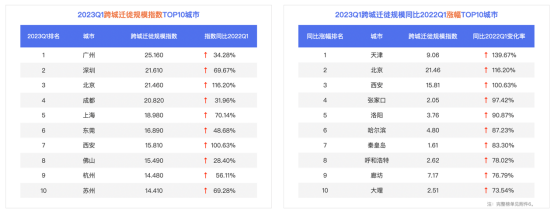 人口流動(dòng)與交通的發(fā)展密不可分。同比2022第一季度,2023第一季度百城跨城遷徙規(guī)模指數(shù)都增,平均漲幅達(dá)到47.64%。最高漲幅城市為天津,漲幅達(dá)139.67%;北京、?安以漲幅116.20%、100.63%位居漲幅榜第二、第三。