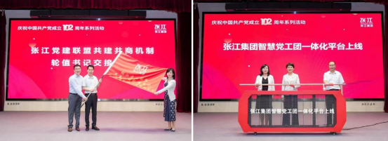 張江黨建聯(lián)盟第三屆輪值書記交接儀式(左)、張江集團智慧黨工團一體化平臺上線(右)