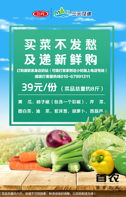 送菜服務是奶站為解決居民買菜困難而啟動的短期業(yè)務。不光是訂奶戶,奶站服務覆蓋的小區(qū)居民只要有需求,都可以選擇訂菜。居民訂購可撥打自家附近小奶箱上的電話號碼與周邊奶站聯系,或撥打客服熱線010-67991311進行預訂。