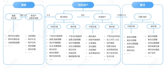 沉默&流失期,需要對(duì)高流失風(fēng)險(xiǎn)客戶深度洞察,進(jìn)行流失用戶召回。一般可以用熱門(mén)內(nèi)容Push進(jìn)行站內(nèi)/站外召回。因?yàn)橛脩袅魇且粋€(gè)過(guò)程,不是一個(gè)節(jié)點(diǎn),用戶流失之后再召回很難100%召回,所以要在用戶流失前,進(jìn)行有效觸達(dá),防止或者延緩用戶流失,并且召回要有周期性,進(jìn)行多次召回?zé)o果的用戶可自動(dòng)標(biāo)記為無(wú)價(jià)值/流失用戶。