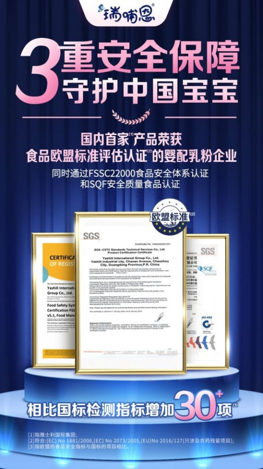 作為乳業(yè)領(lǐng)軍企業(yè),雅士利國際的質(zhì)量文化建設(shè)一直走在行業(yè)前沿,也由此獲得業(yè)內(nèi)多項認(rèn)可,榮獲國際權(quán)威認(rèn)證機(jī)構(gòu)SGS授予的嬰幼兒配方食品歐盟標(biāo)準(zhǔn)評估認(rèn)證的產(chǎn)品認(rèn)證證書,成為國內(nèi)首家產(chǎn)品榮獲食品歐盟標(biāo)準(zhǔn)評估認(rèn)證的嬰配粉乳粉企業(yè),同時還獲得FSSC22000食品安全體系認(rèn)證和SQF食品安全質(zhì)量認(rèn)證。