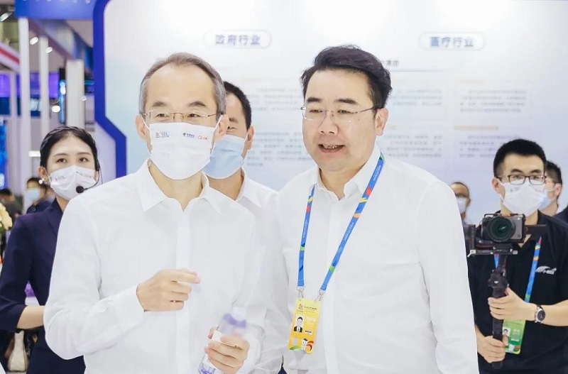中國(guó)電信集團(tuán)副總經(jīng)理唐珂(左)一行參觀新華三展區(qū),新華三集團(tuán)電信系統(tǒng)部總經(jīng)理李建濤(右)陪同