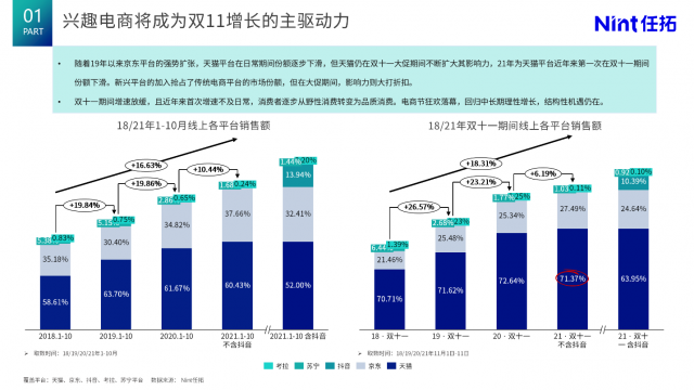 興趣電商將成為雙11增長的主驅(qū)動(dòng)力 回顧2018年-2021年雙11全域電商增長趨勢可見,2018年-2021年全域電商雙11銷售增長逐步放緩,2021年,不含抖音銷售規(guī)模,僅維持個(gè)位數(shù)增長。