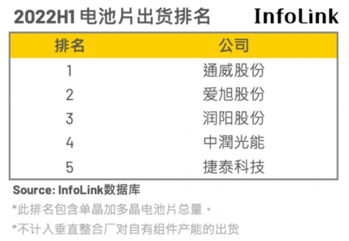 據(jù)PVInfoLink統(tǒng)計,今年上半年晶硅電池總產(chǎn)量約135.5GW。TOP5的通威股份、愛旭股份、潤陽股份、中潤光能、捷泰科技,總出貨量約59GW,占43.54%。另有投研機(jī)構(gòu)統(tǒng)計,TOP5出貨中,通威出貨約為22.5GW、愛旭出貨約為17GW、潤陽出貨約為13GW、中宇出貨約為5GW,捷泰出貨約為3GW。