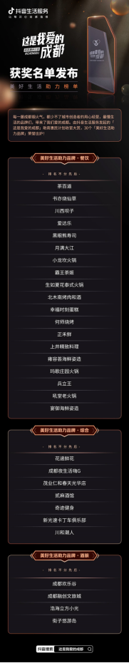 2022年11月4日,由抖音生活服務(wù)發(fā)起的「這是我愛(ài)的成都」助商惠民計(jì)劃收官大賞,以一場(chǎng)「這是我愛(ài)的成都·美好生活助力榜單」榮譽(yù)發(fā)布,對(duì)活動(dòng)期間為成都播撒生活美好的30個(gè)品牌和10位達(dá)人做出總結(jié)與嘉獎(jiǎng)。