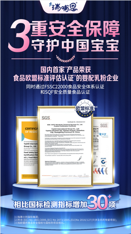 秉承“消費(fèi)者第一第一第一”的企業(yè)價(jià)值觀,蒙牛瑞哺恩對(duì)標(biāo)全球最嚴(yán)標(biāo)準(zhǔn),全面啟動(dòng)歐盟標(biāo)準(zhǔn)升級(jí),憑借著高標(biāo)準(zhǔn)、嚴(yán)要求,瑞哺恩國內(nèi)4家工廠均順利拿下國際權(quán)威認(rèn)證機(jī)構(gòu)SGS授予的歐盟食品標(biāo)準(zhǔn)認(rèn)證,蒙牛瑞哺恩更成為國內(nèi)首款通過食品歐盟標(biāo)準(zhǔn)評(píng)估認(rèn)證的嬰配乳粉產(chǎn)品,同時(shí)還獲得SGS授予的FSSC2200食品安全體系認(rèn)證和SQF食品安全質(zhì)量認(rèn)證,代表著蒙牛瑞哺恩旗下的嬰幼兒配方奶粉的生產(chǎn)已達(dá)到國際一流水平。