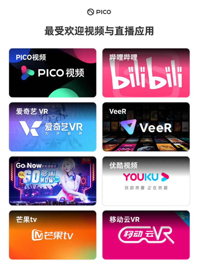 作為頭部XR品牌,PICO始終致力于幫助VR開啟大眾化之路,而豐富且優(yōu)質(zhì)的內(nèi)容和應用生態(tài),是吸引大眾消費者購買VR、使用VR的關鍵。近兩年全球VR技術日漸成熟,產(chǎn)品快速迭代,PICO作為國內(nèi)最完善的VR內(nèi)容平臺,亦在持續(xù)完善內(nèi)容生態(tài),積極加速與第三方的合作腳步,并在自制內(nèi)容方面大力投入,致力打造國內(nèi)應用最豐富、最優(yōu)質(zhì)的VR內(nèi)容平臺。迄今為止PICO應用商店已擁有超過200款國內(nèi)外優(yōu)質(zhì)的VR應用。