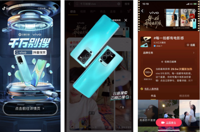 例如,在「千萬(wàn)別搜」第一季中,vivo便通過兼具時(shí)尚感與科技感的創(chuàng)意開屏激發(fā)用戶點(diǎn)擊興趣,讓用戶通過點(diǎn)擊一鍵直達(dá)熱點(diǎn)品專并彈出彩蛋承接用戶興趣,進(jìn)一步聯(lián)動(dòng)#每一拍都有電影感話題轉(zhuǎn)化經(jīng)營(yíng)——通過這條完整的路徑,vivo實(shí)現(xiàn)話題頁(yè)5.3億曝光、全民任務(wù)播放量超穩(wěn)定播放區(qū)間最高值1.8倍的超預(yù)期佳績(jī)。
