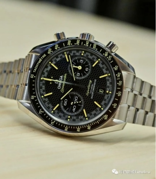 超霸Super Racing的盤面布局,是雙眼計時盤,3點位是60分鐘和12小時計時盤 (兩根計時指針是同軸的),9點位是小秒針。但凡是歐米茄9系計時機(jī)芯,都是這種布局。手表盤面上呈現(xiàn)“蜂巢”結(jié)構(gòu)。
