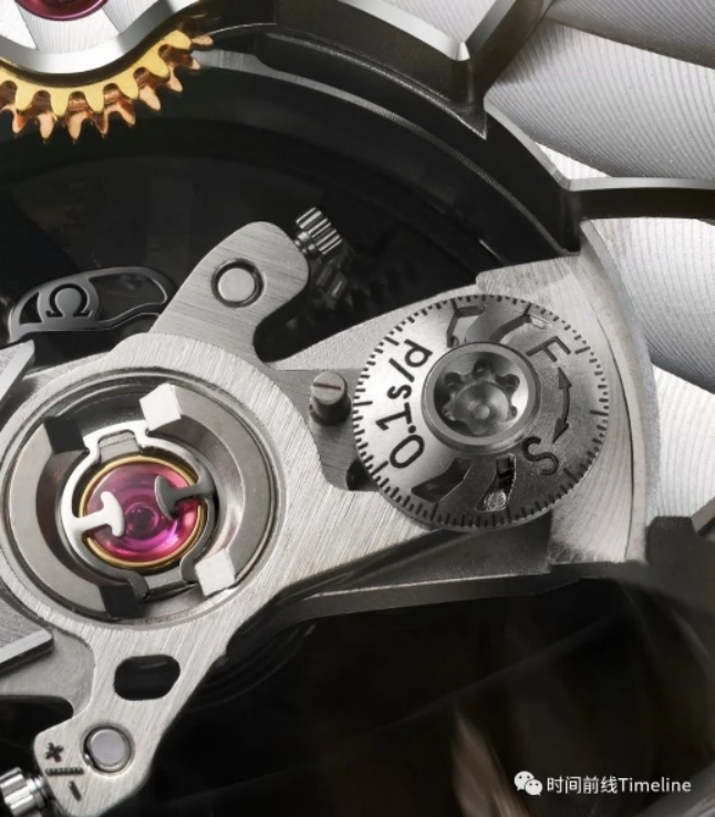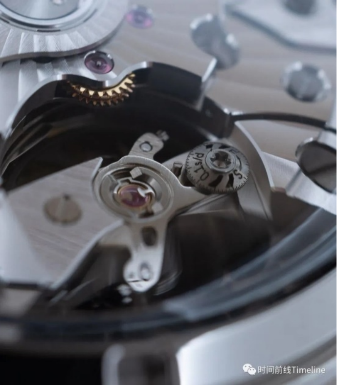 在擺輪夾板的Spirate“小圓片”上,寫有0.1s/d,代表調(diào)節(jié)精度可以達(dá)到0.1秒/每天。
