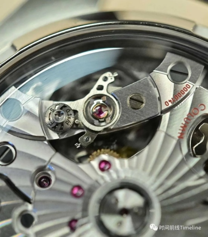 使用柱狀輪,垂直離合,硅游絲,無卡度砝碼微調(diào),擺頻28800次/時,動力60小時。但各位可以看到,擺輪夾板上,多了Spirate系統(tǒng)的調(diào)節(jié)“小圓片”。