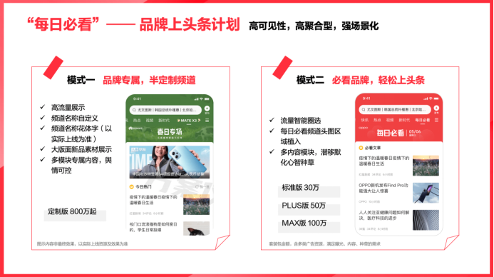 針對新品強(qiáng)勢宣發(fā)的訴求,今日頭條的“定制頻道”可以讓新品穩(wěn)穩(wěn)“C位出道”。定制頻道采用組合式玩法,按照用戶閱讀瀏覽習(xí)慣,基于“曝光/種草/轉(zhuǎn)化”打造“頻道LOGO冠名+必看文章+品牌好物+推薦視頻”等分梯度場景化資源包,逐層講透品牌和產(chǎn)品價值,促進(jìn)品牌影響力傳播的最大化。