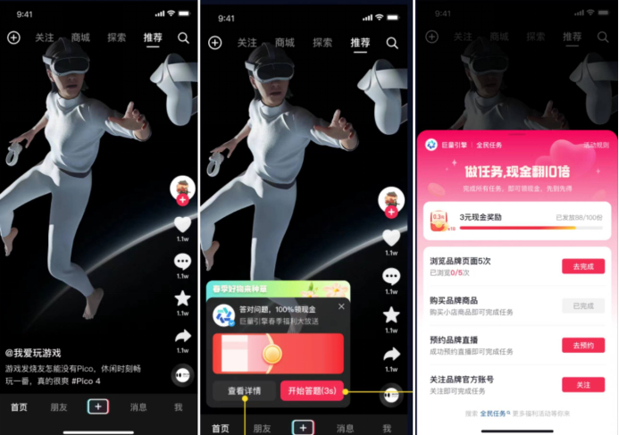 在產(chǎn)品價值的深度種草上,“答題種草”是一種新解法:在種草視頻講解過程中,前置答題/競猜活動利益點,激發(fā)用戶互動;品牌設(shè)定的問題,可與種草素材深度綁定,突出產(chǎn)品賣點和價值;答題互動后,用戶即有機(jī)會獲得激勵,完成品牌額外定制任務(wù),讓現(xiàn)金獎勵膨脹10倍。