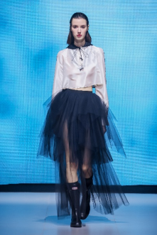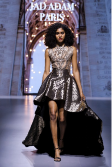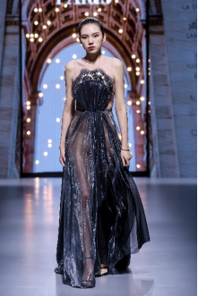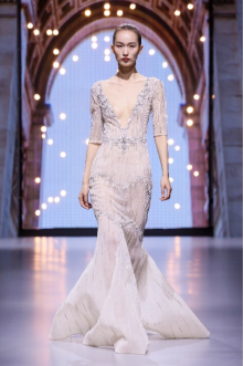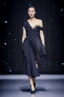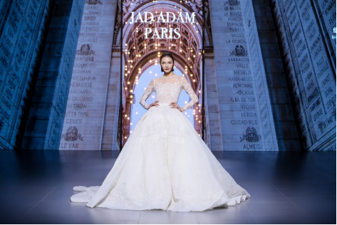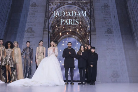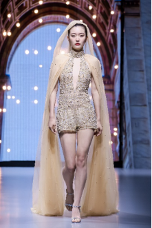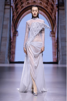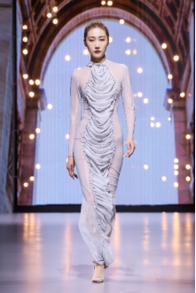 在充滿異域風(fēng)情的“巴爾米拉女王”主題發(fā)布中,法國高定女裝設(shè)計師JadAdam攜手紹興永耀紡織品有限公司、紹興晶遠(yuǎn)創(chuàng)意設(shè)計有限公司展現(xiàn)了尋找內(nèi)心平靜的啟蒙之旅的獨特過程。設(shè)計師從柯橋優(yōu)秀的面料中獲得啟發(fā),在華麗的禮服裙中采用了大量的刺繡及繡片繡珠工藝。兩家企業(yè)提供的閃光高密度歐根紗、銀色金屬絲、清透網(wǎng)眼等面料,花型立體簡潔、色彩透亮多變,為設(shè)計師帶來了豐富的靈感。從晚禮服、婚紗到高級時裝,JadAdam通過特有的藝術(shù)表現(xiàn)手法詮釋了本次禮服設(shè)計。