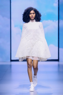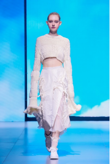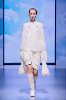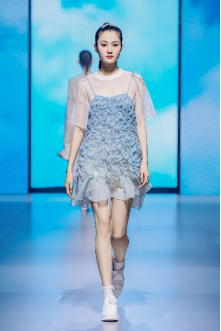 在“童年”主題秀演中,法國設(shè)計師聯(lián)袂浙江懿紗紡織科技有限公司、紹興柯橋豐旺紡織品有限公司,圍繞兒童的藝術(shù)、回到學(xué)校、童年的回憶三個子主題,共同演繹了童年的懷舊故事。設(shè)計師以精細(xì)的絎縫、印染、明線縫紉及自然著色的效果制作服裝和圖案,在工藝上采用了法國特有的編織技術(shù),并結(jié)合WALTZ系列花紗、三醋酸、錦滌歐根紗、六角硬網(wǎng)等面料輕薄有型、色彩飽滿的特色,最大程度實現(xiàn)了紡織工藝的價值化。特別是在傳統(tǒng)手工藝非遺、生態(tài)環(huán)保材料等系列元素的加持下,為整場秀演增添了可持續(xù)時尚的價值。