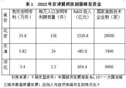 與北京相比,天津和河北在創(chuàng)新能力方面仍存在較大差距,近年來差距進一步擴大,制約了京津冀三地的創(chuàng)新合作空間。從創(chuàng)新投入來看,《2023京津冀將如何推進?》表明,2022年北京研發(fā)投入強度達到6.44%,天津和河北研發(fā)投入強度分別為3.44%和1.75%,遠低于北京的投入水平,河北低于全國平均水平0.65個百分點。自2014年以來,天津和河北與北京之間的差距一直很大。從研發(fā)資金的絕對數(shù)量來看,2022年差距很大(見表1)。近年來,京津冀三地的金融支持能力進一步擴大,縮小差距變得更加困難?!冻鞘兴{皮書:中國城市發(fā)展報告No.15——大國治城之城市群高質(zhì)量發(fā)展:邁向人與自然和諧共生的現(xiàn)代化》中指出,從創(chuàng)新產(chǎn)出來看,2022年,北京專利授予量為16.3萬件,分別是河北和天津的1.8倍和2.2倍;有效發(fā)明專利33.6萬件,分別是河北和天津的9.9倍和8.8倍。以人均人數(shù)而言,差距更為明顯,北京每萬人的發(fā)明專利數(shù)量大約是河北的10倍。