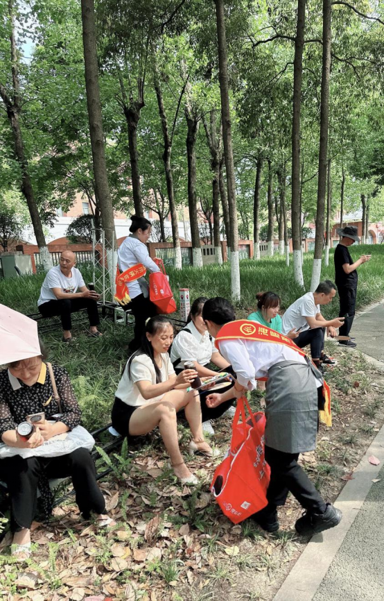 “天氣太熱了,喝點(diǎn)楊梅汁解解暑吧,祝您的孩子馬到功成,前程似錦!”在成都市新都中學(xué)高考考點(diǎn)門前,來自海底撈七一廣場(chǎng)店的志愿者員工們向等候的家長(zhǎng)送上清涼解暑的飲品和小扇子。