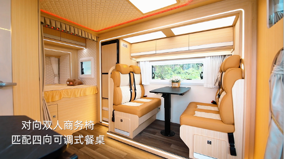 踏入房車內(nèi)部,菱形金絲縫線軟包車頂配合淺木紋飾面家具,目光所至,皆是精致歐系風(fēng)尚,品味盡顯。寬敞舒適的空間布局,帶來家的溫馨氣息。廚房設(shè)備齊全,休閑區(qū)配備多人卡座、可升降桌臺、JBL揚(yáng)聲器及智能網(wǎng)絡(luò)電視等,帶來美食+娛樂疊加的趣味。