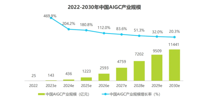 報(bào)告指出,2023年中國(guó)AIGC產(chǎn)業(yè)規(guī)模約為143億元,隨后進(jìn)入大模型培育期,持續(xù)打造與完善底層算力基建、大模型商店平臺(tái)等新型基礎(chǔ)設(shè)施,以此孕育成熟技術(shù)與產(chǎn)品形態(tài)并將其對(duì)外輸出。到2030年中國(guó)AIGC產(chǎn)業(yè)規(guī)模有望突破萬億元,達(dá)到11441億元。
