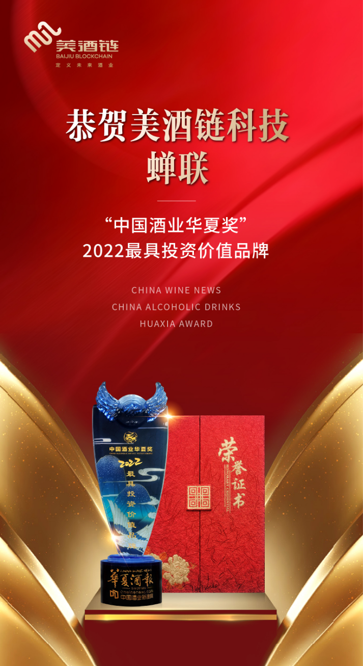2023年“中國酒業(yè)華夏獎”頒獎典禮于4月10日下午在成都祥宇賓館舉行,美酒鏈科技因具有突出的科技創(chuàng)新表現(xiàn)、賦予高端白酒收藏和價值賦能的行業(yè)影響力,再次蟬聯(lián)“中國酒業(yè)華夏獎:2022最具投資價值品牌”獎項,這是中國酒業(yè)權威機構和消費大眾對美酒鏈科技創(chuàng)新精神的高度認可。