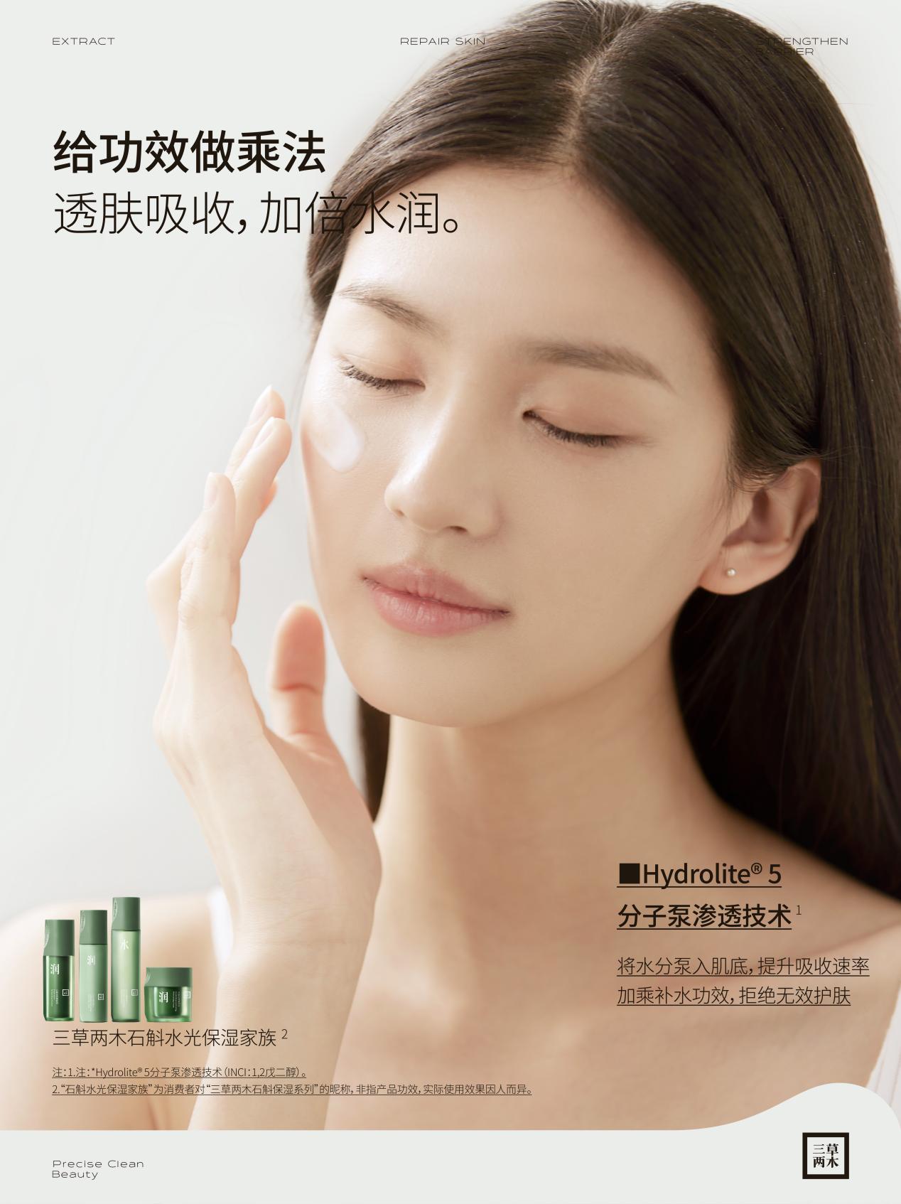 此外,三草兩木石斛系列還創(chuàng)造性地使用了Hydrolite? 5分子泵滲透技術(shù),在肌膚皮層中建立一座“輸水分子泵”,使得功效成分穿過肌膚皮層,直接泵入真皮層,大大地提升了功效成分的生物利用度,將水分切實(shí)輸送至肌底,擺脫外層濕潤、內(nèi)層干燥的“假潤”困局,幫助肌膚實(shí)現(xiàn)由內(nèi)而外的瑩潤水亮。