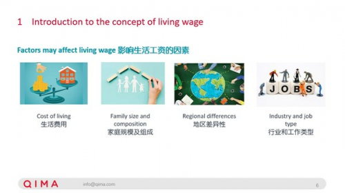 如何確定生活工資?啟邁QIMA專(zhuān)家介紹,生活費(fèi)用、家庭規(guī)模及組成、地區(qū)差異性、行業(yè)和工作類(lèi)型都是影響生活工資的因素。通常是先確定特定地區(qū)基本但體面生活的成本,包括食物、住房、教育、醫(yī)療保健、交通、服裝、意外開(kāi)支及其他家庭基本需求。然后將家庭的總成本除以家庭中在職成年人平均數(shù),并考慮其他收入者的貢獻(xiàn),并根據(jù)當(dāng)?shù)貎r(jià)格和類(lèi)型進(jìn)行量身定制。這個(gè)數(shù)值代表該地區(qū)一個(gè)工薪階層單月的必要實(shí)得工資或凈生活工資。最后,凈生活工資根據(jù)稅收和扣除額進(jìn)行調(diào)整。