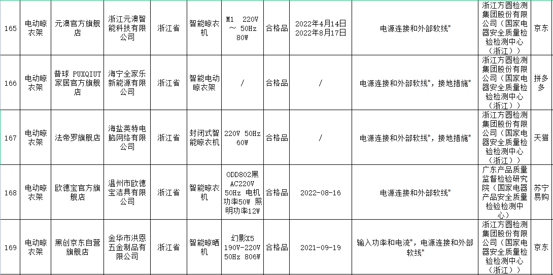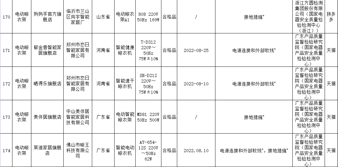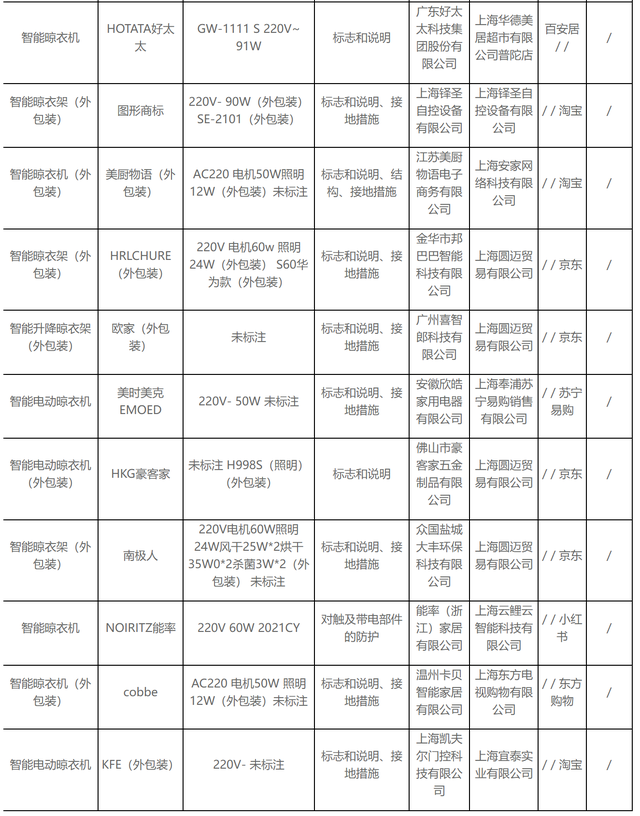 無獨有偶,據(jù)上海市市場監(jiān)督管理局發(fā)布的2022年上海市產(chǎn)品質(zhì)量監(jiān)督抽查結(jié)果(第十批)顯示,11批次智能晾衣架抽查不合格,其中涉及HOTATA好太太、美時美克EMOED、南極人等品牌。