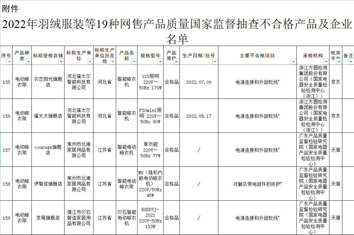 近日,市場監(jiān)管總局通報了2022年羽絨服、電動晾衣架等19種網(wǎng)售產(chǎn)品質(zhì)量國家監(jiān)督抽查情況。結(jié)果顯示,2022年度電動晾衣架抽查不合格率高達46.2%,為19種抽查產(chǎn)品中最高。