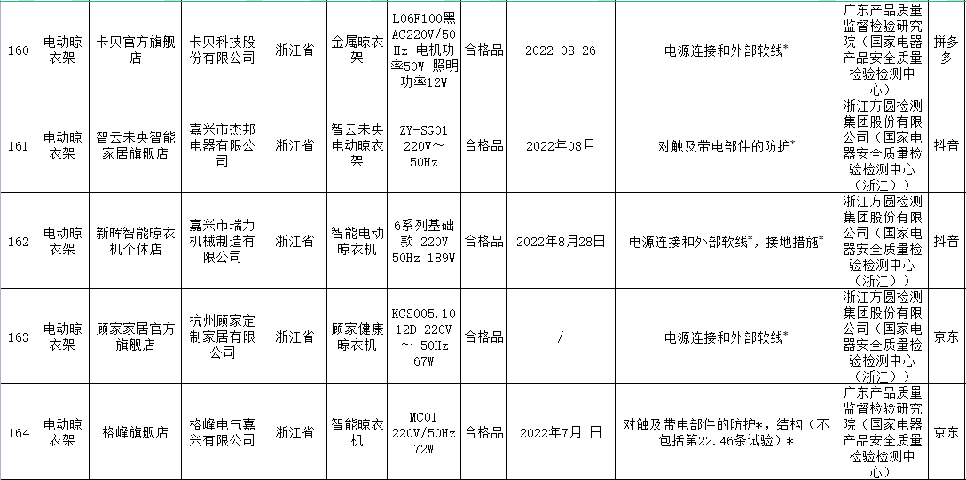 本次電動晾衣架抽查檢驗9個省(市)48家企業(yè)生產(chǎn)的52批次產(chǎn)品,包括天貓、京東、拼多多、抖音等電子商務(wù)平臺,發(fā)現(xiàn)24批次產(chǎn)品不合格,涉及卡瑞琪(courage)、顧家、格峰、盼盼、歐蘭特等品牌。